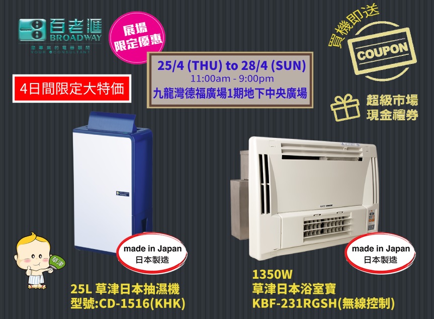 一田購物優惠日- 30週年大折慶 ( 25/11 – 01/12 ) KUSATSU " 草津 " 抽濕機 / 浴室寶 特選優惠 , 勿失良機 隆重登場 最新型號 窗口式 ( 纖巧型 ) 日本製造